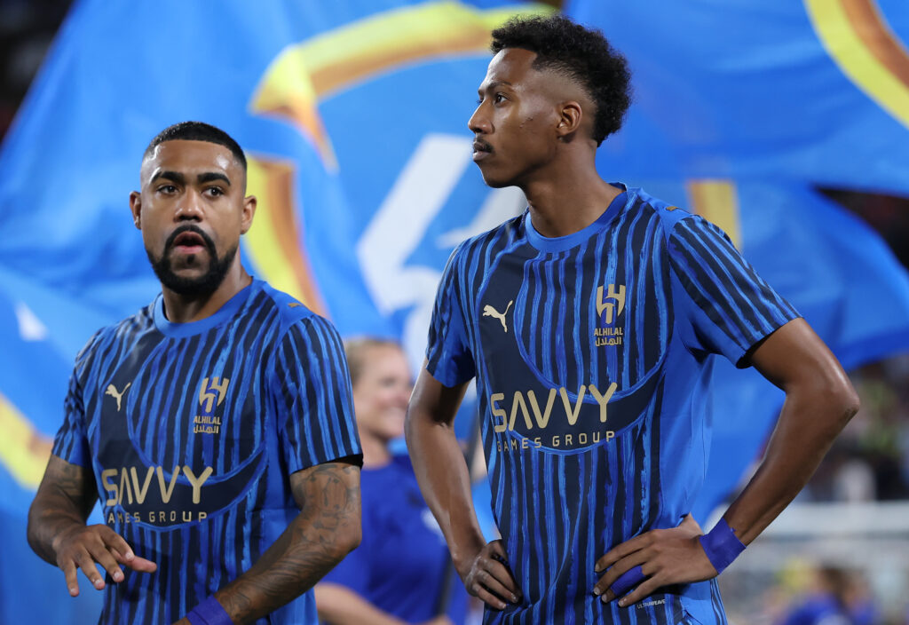 Malcom #77 y Nasser Aldawsari #16 del Al Hilal miran antes del partido por el Campeonato Mundial de Clubes de la FIFA 20025 entre Manchester City y Al-Hilal en el Camping World Stadium el 30 de Junio 2025 en Orlando, Florida. (Photo by Elsa – FIFA/FIFA via Getty Images)