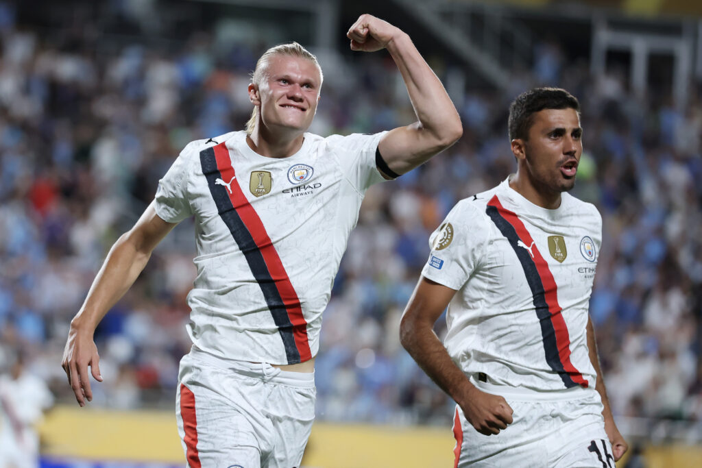 Erling Haaland #9 del Manchester City celebra anotar el segundo de su equipo junto a Rodri #16 durante el partido del Campeonato Mundial de Clubes de la FIFA 20025 entre Manchester City y Al-Hilal en el Camping World Stadium el 30 de Junio 2025 en Orlando, Florida. (Photo by Elsa – FIFA/FIFA via Getty Images)